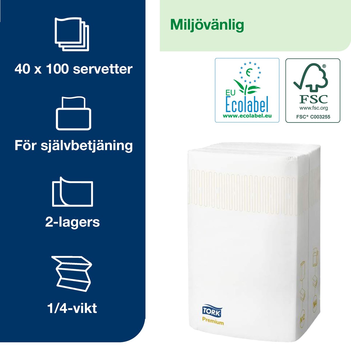 Extra mjuka servetter av högsta kvalitet (Premium). Ligger vikta så att nästa ark automatiskt dras fram och ligger kvar för nästa person. 1/4-vikta, 2-lags. Format: 21,3 x 33 cm. 500 st/förp. 8 förp./kartong.