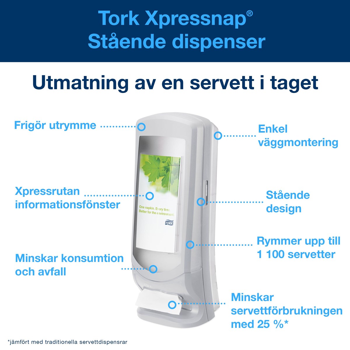 Stående servettdispenser som också kan hängas på väggen. Placera eget budskap i reklamrutan. Hög kapacitet – rymmer 1100 N4-servetter. Format: H62,2 x B23,5 x D23,5 cm.