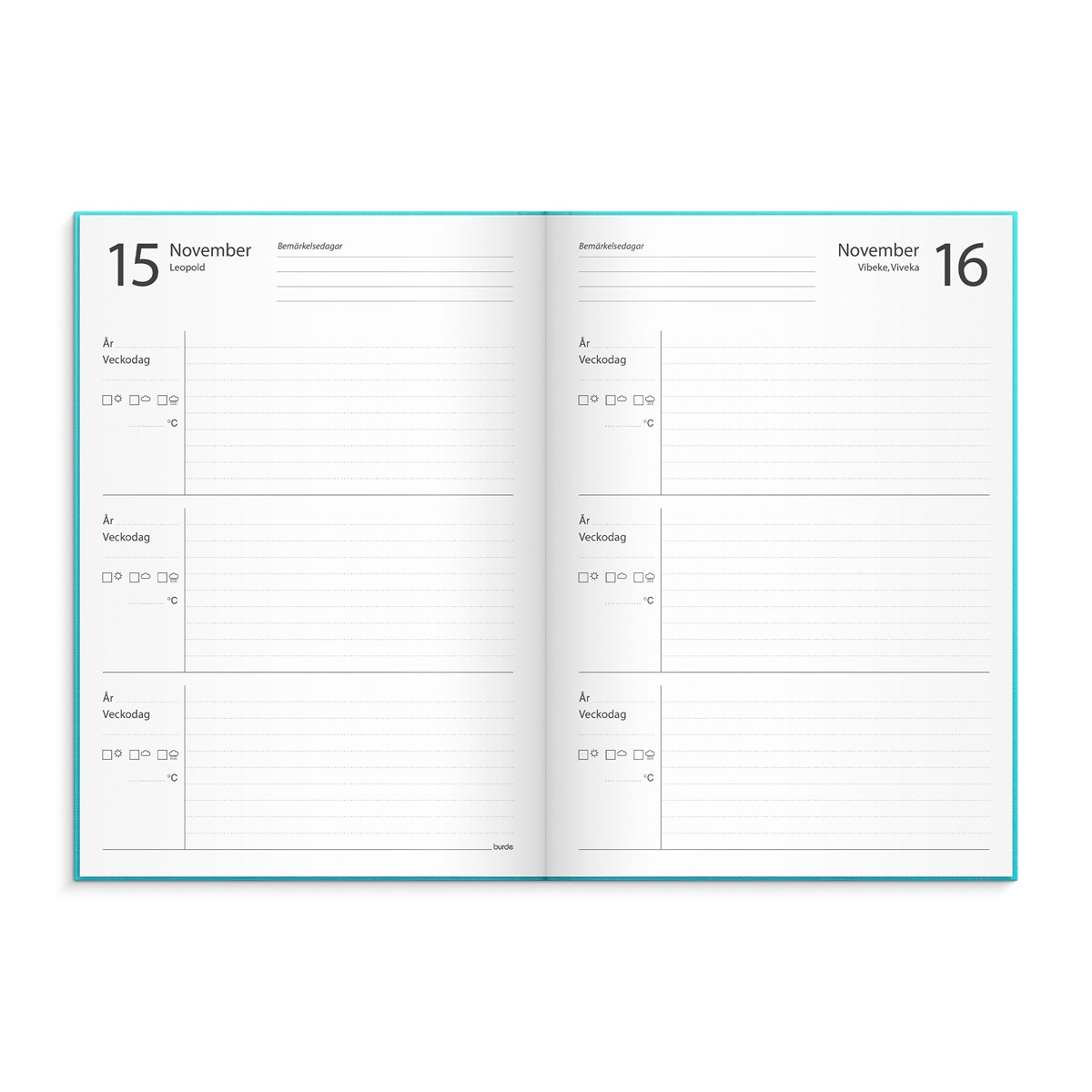 Dagbok som sträcker sig över tre år, årsneutral. Namnsdagsregister. Inbunden. Format: 142x205 mm.
