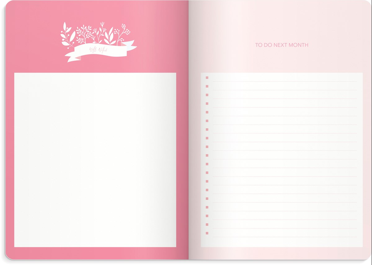 Inbunden, odaterad kalender i mjukt, mörkrosa kartongomslag med silverprägling med vitt märkband och pappersficka bak. Smart planeringsverktyg med att-göra-listor för varje månad, vecka och nästkommande månad, plats för dagliga anteckningar, samt prickade sidor för egna kreationer. Engelsk inlaga. 90 g vitt papper, 128 vita blad (256 sidor). Format: A5.