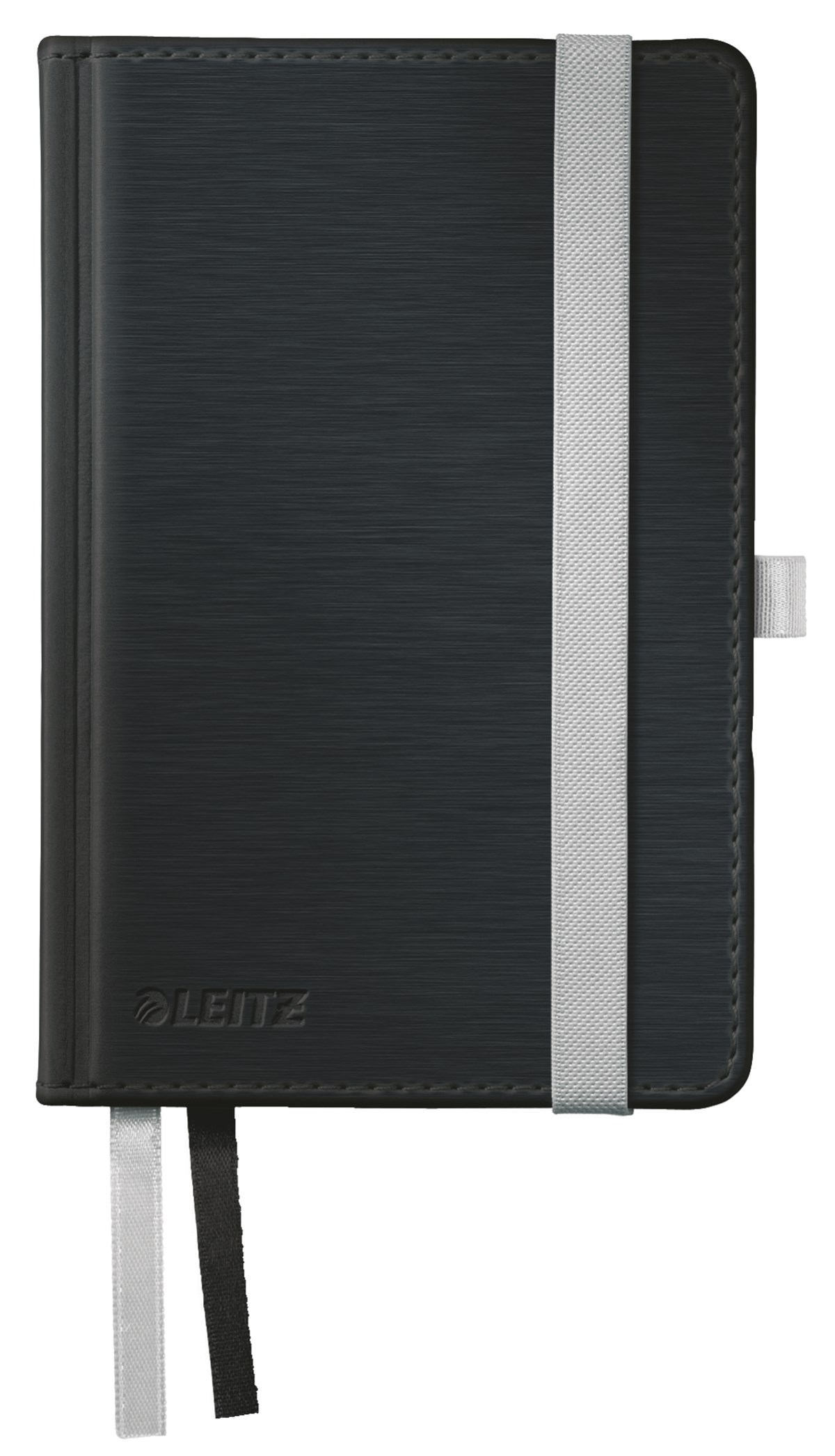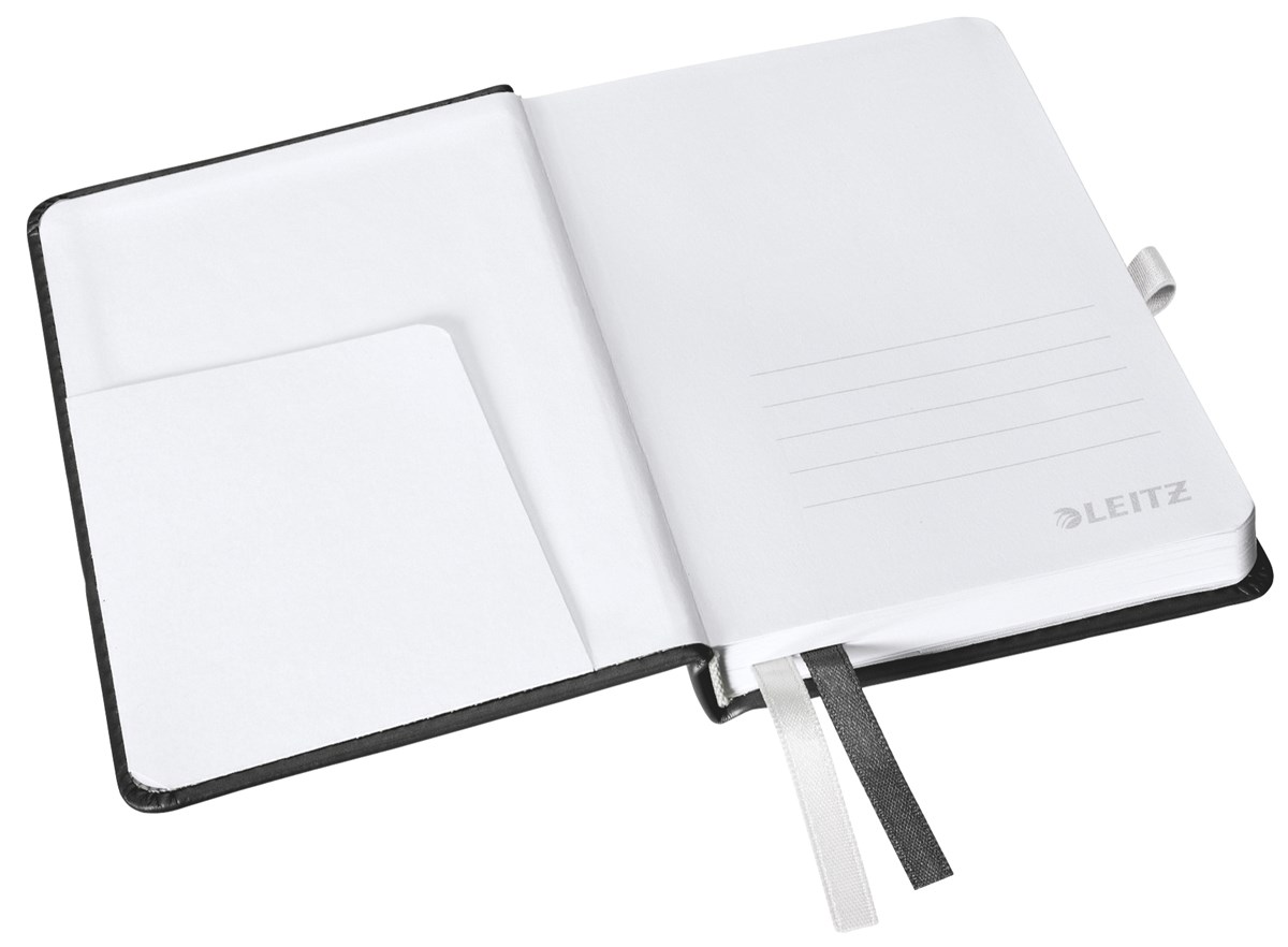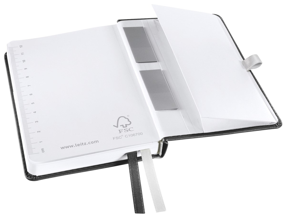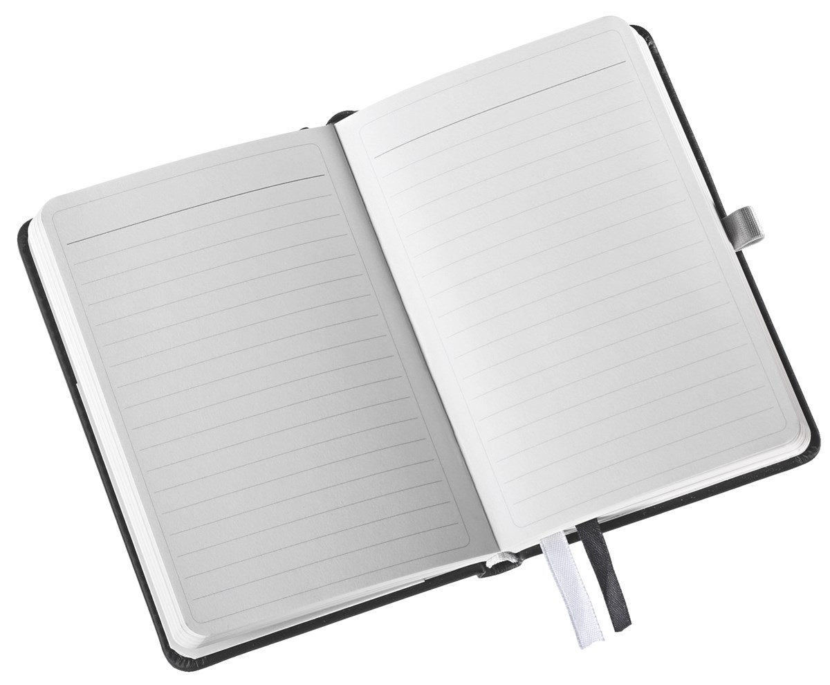 Distinkt, modern design för vardagsanteckningar. Linjerat elfenbensfärgat papper av hög kvalitet. Gummibandsförslutning och pennhållare. Två tygband som hjälper dig att hitta och öppna viktiga sidor snabbt. De sista åtta sidorna är perforerade för enkel avrivning. Integrerad, expanderbar ficka på insidan av omslaget för förvaring av lösa papper och småsaker. Två buntar med självhäftande märkflikar medföljer för markering av viktig information. 80 blad.