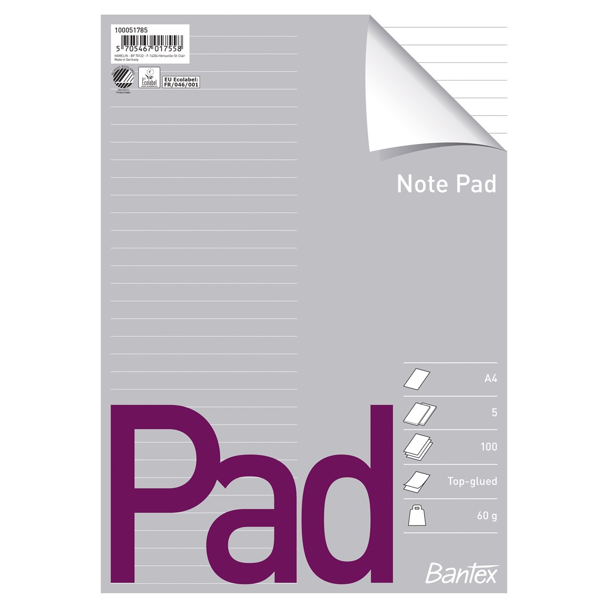 Vitt 60 g papper som är limmat på kortsidan. 100 linjerade blad. A5-format. 5 st/förp.