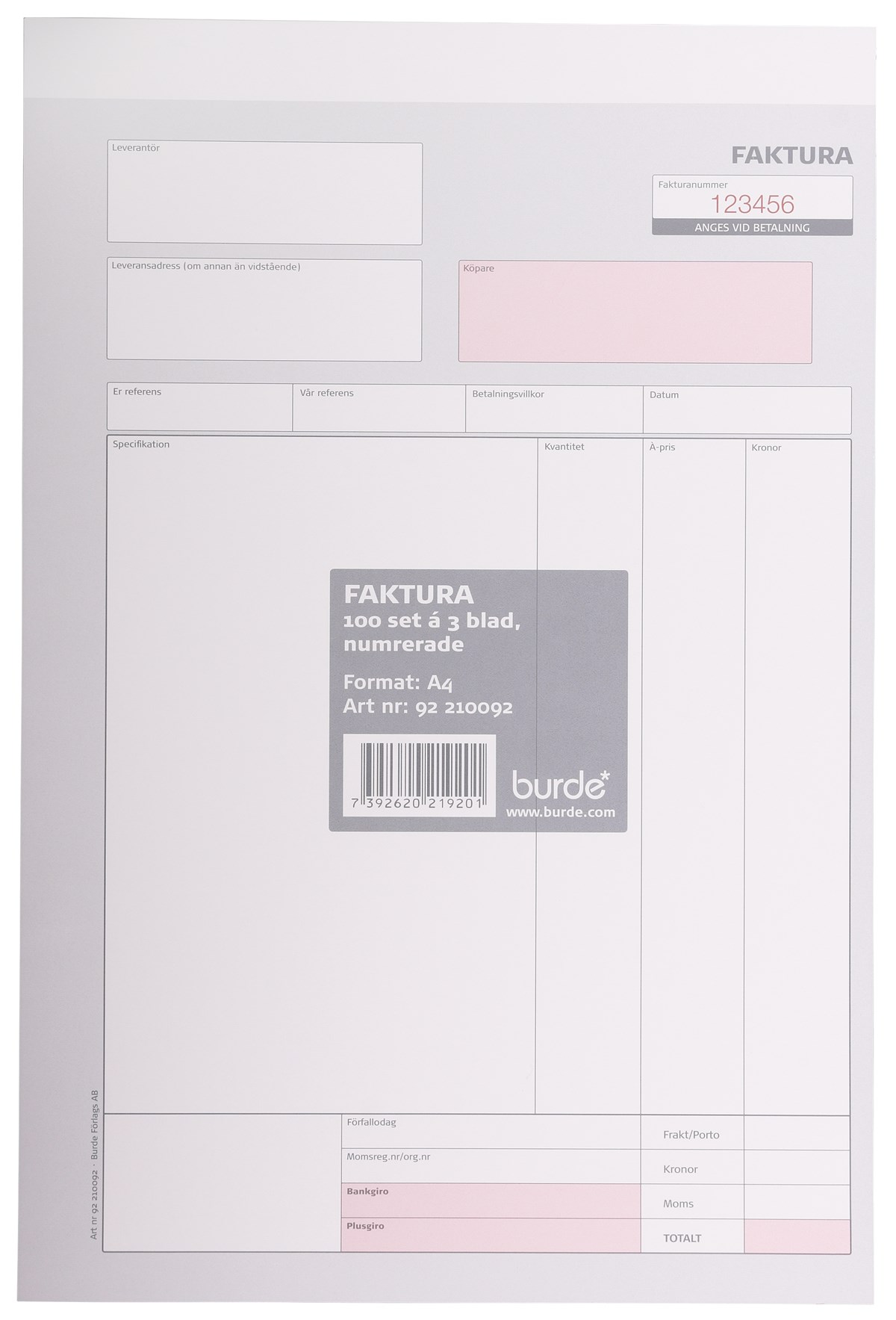 Numrerade fakturor med 2 kopior. Självkopierande papper. Stamsats om 3 blad. Format: A4.