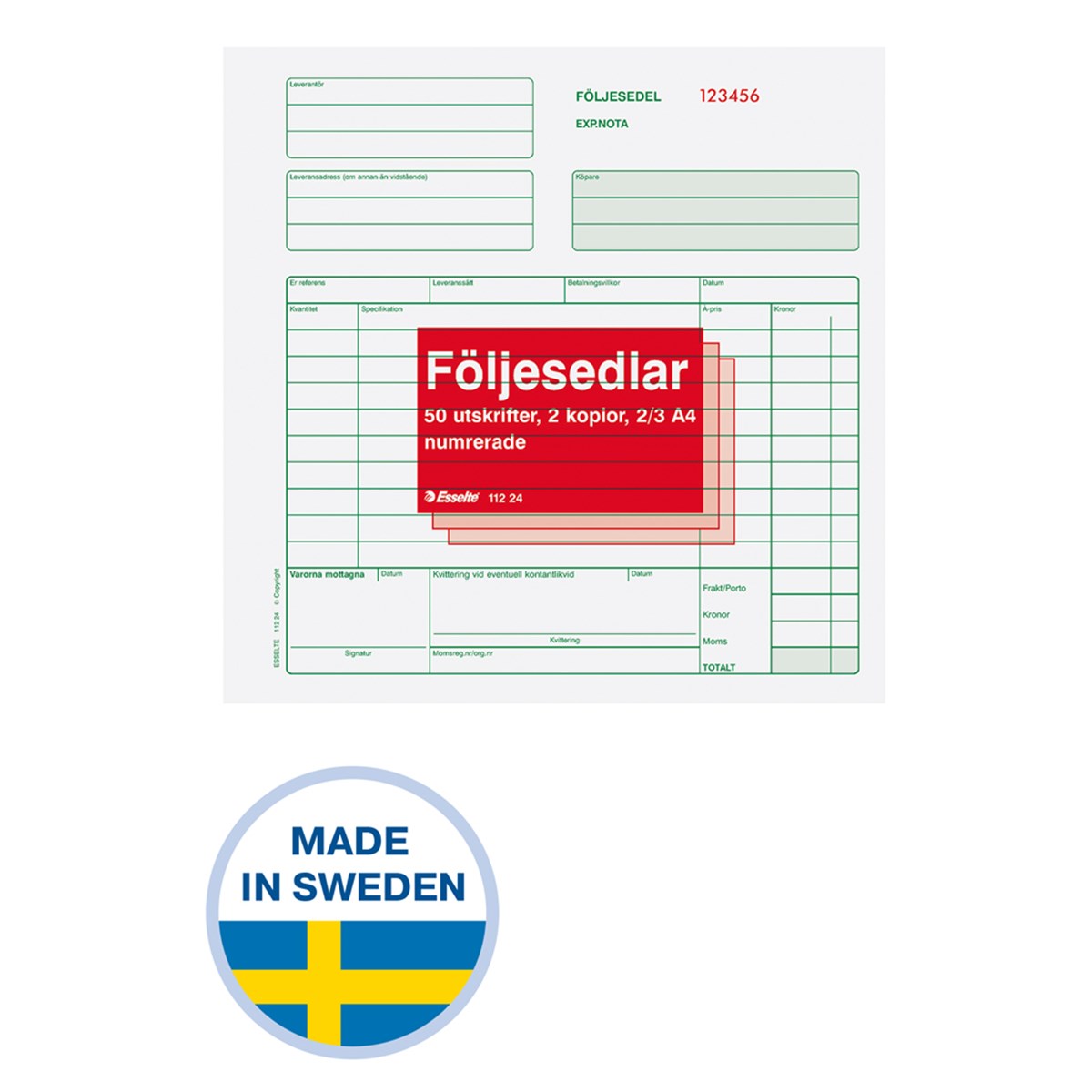 Numrerade följesedlar med 2 kopior per set. Självkopierande papper. 3 x 50 blad. Format: 2/3 A4 (240x210 mm). 5 st/förp.