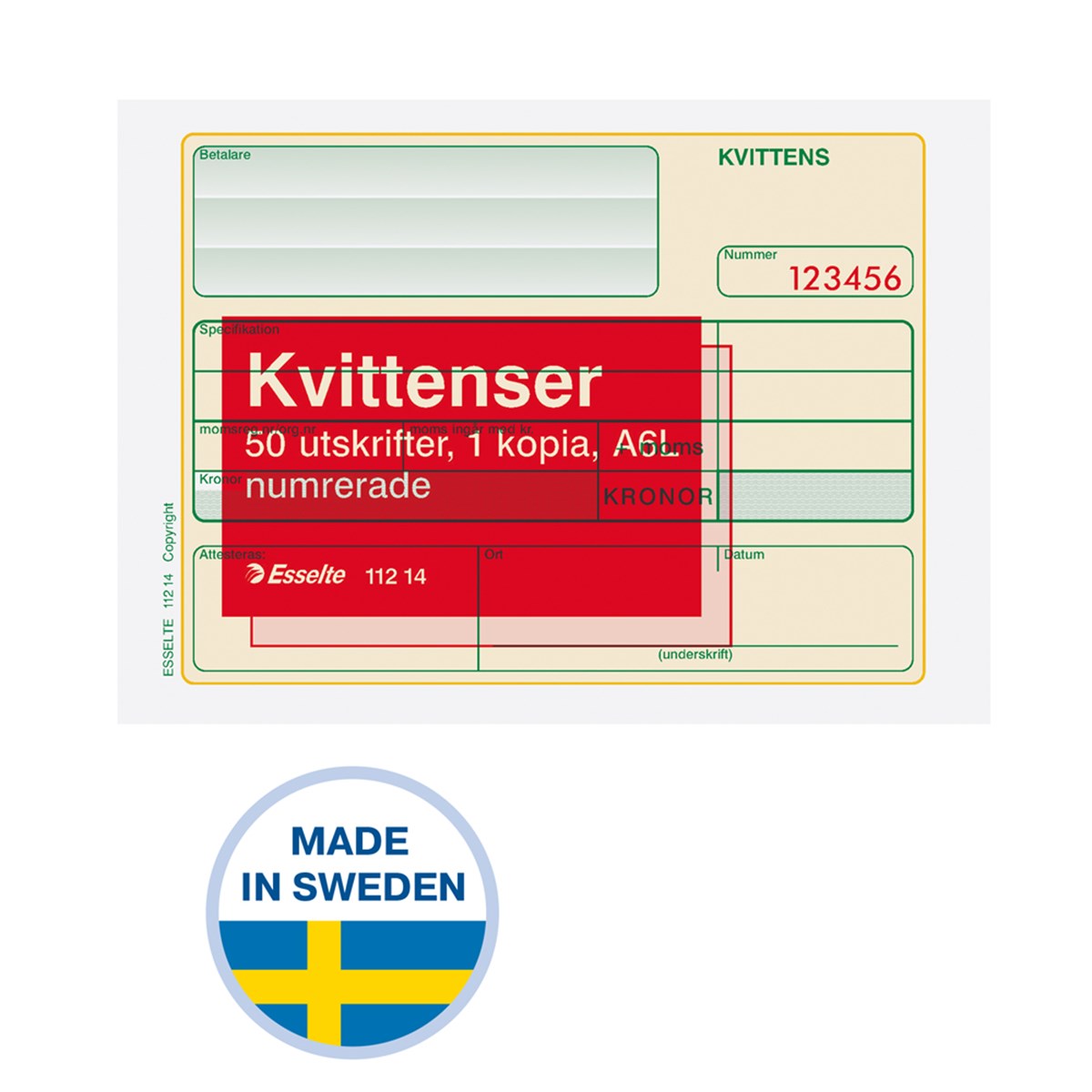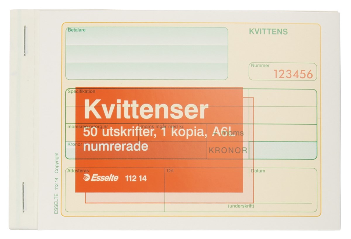 Numrerade kvittenser med en kopia (självkopierande papper). 2x50 blad.