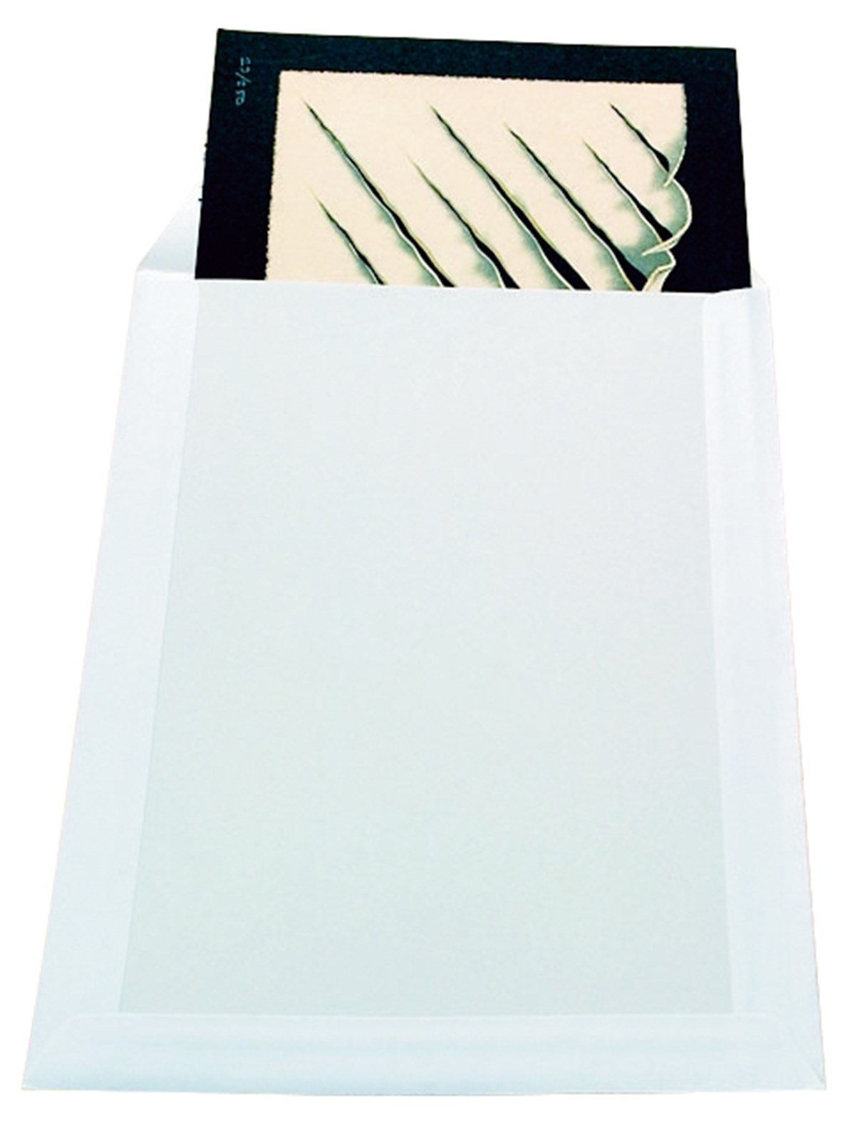 Vit med pappbaksida. Tillverkad av vitt kraftpapper ECF. Självhäftande täckremsa, Peel & Seal.