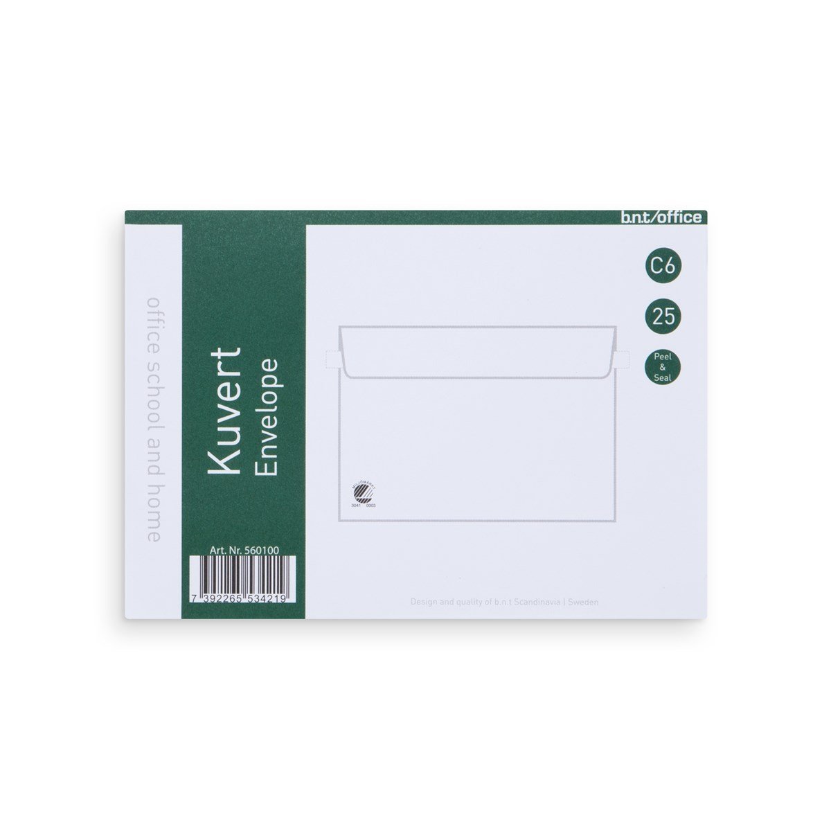 Självhäftande Peel & Seal. Vitt kuvert med grått innertryck.