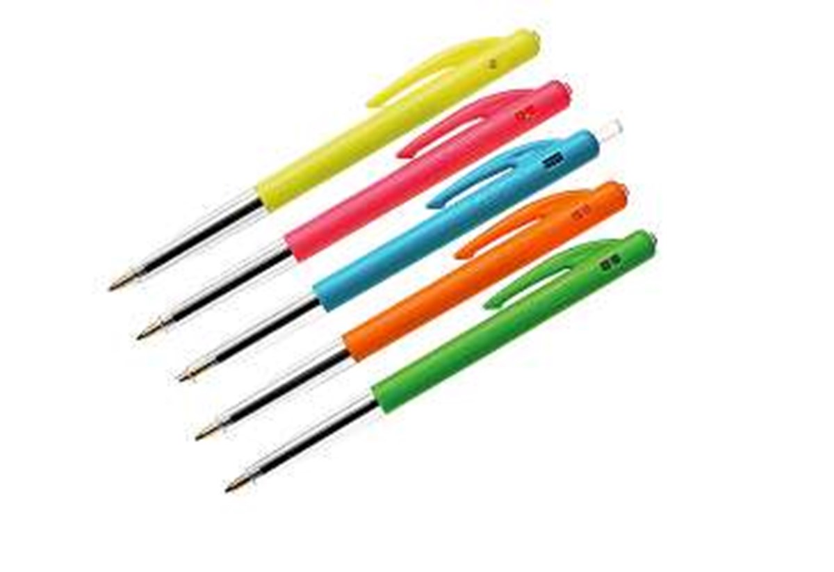 Klassisk kulspetspenna med tryckmekanism på sidan och räfflor runt greppet. Kulbredd 1,0 mm, skrivbredd 0,4 mm. Skrivlängd ca 2000 m. Dokumentäkta bläck enligt ISO 12757-1 och 12757-2. Blandade färger (gul, grön, orange, rosa och blå). 50 st/förp.