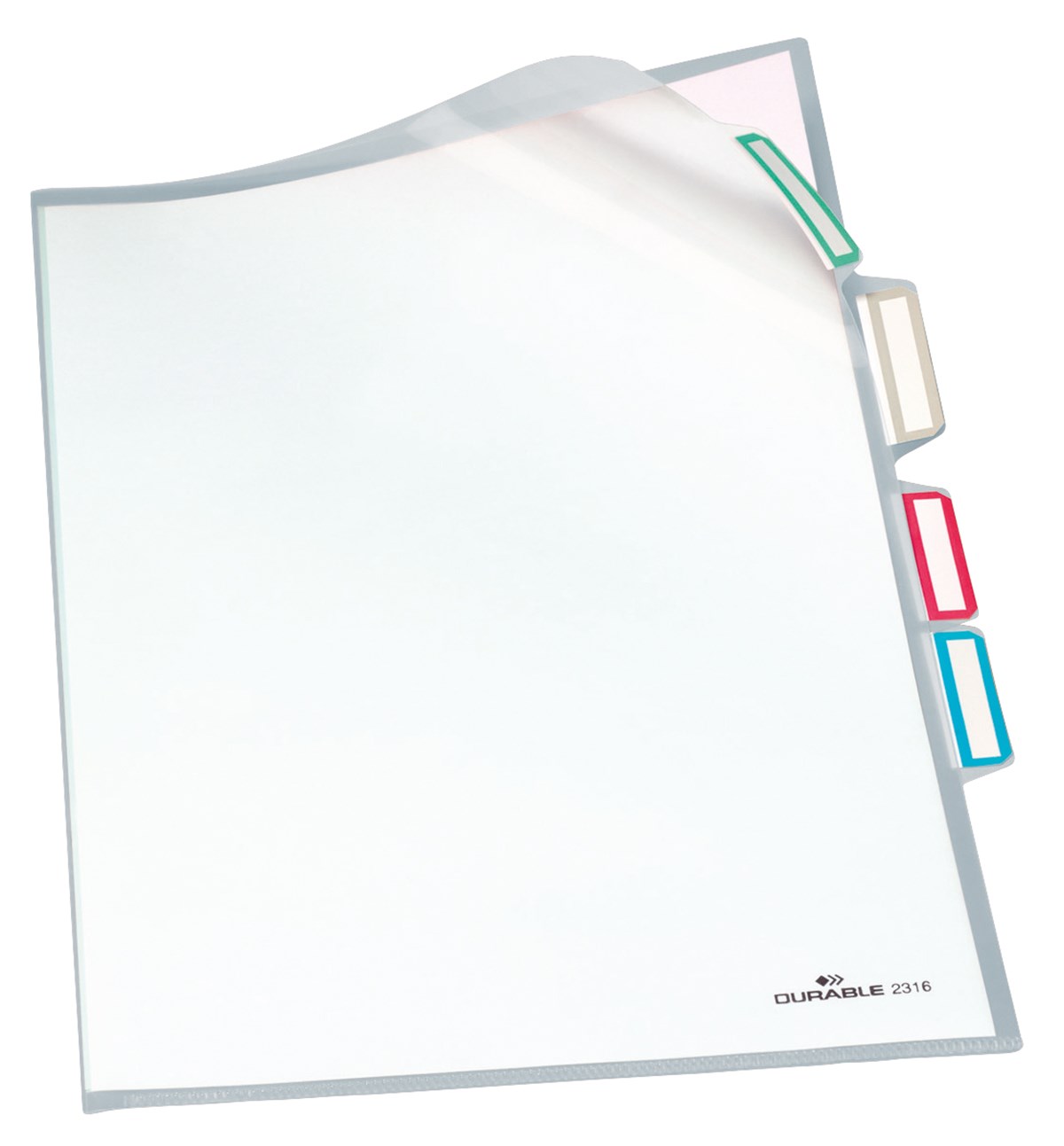 Praktisk mapp för A4-papper. Enkel flikindelning. Färgade och självhäftande etiketter för märkning av flikarna medföljer. Transparent. 5 st/förp.