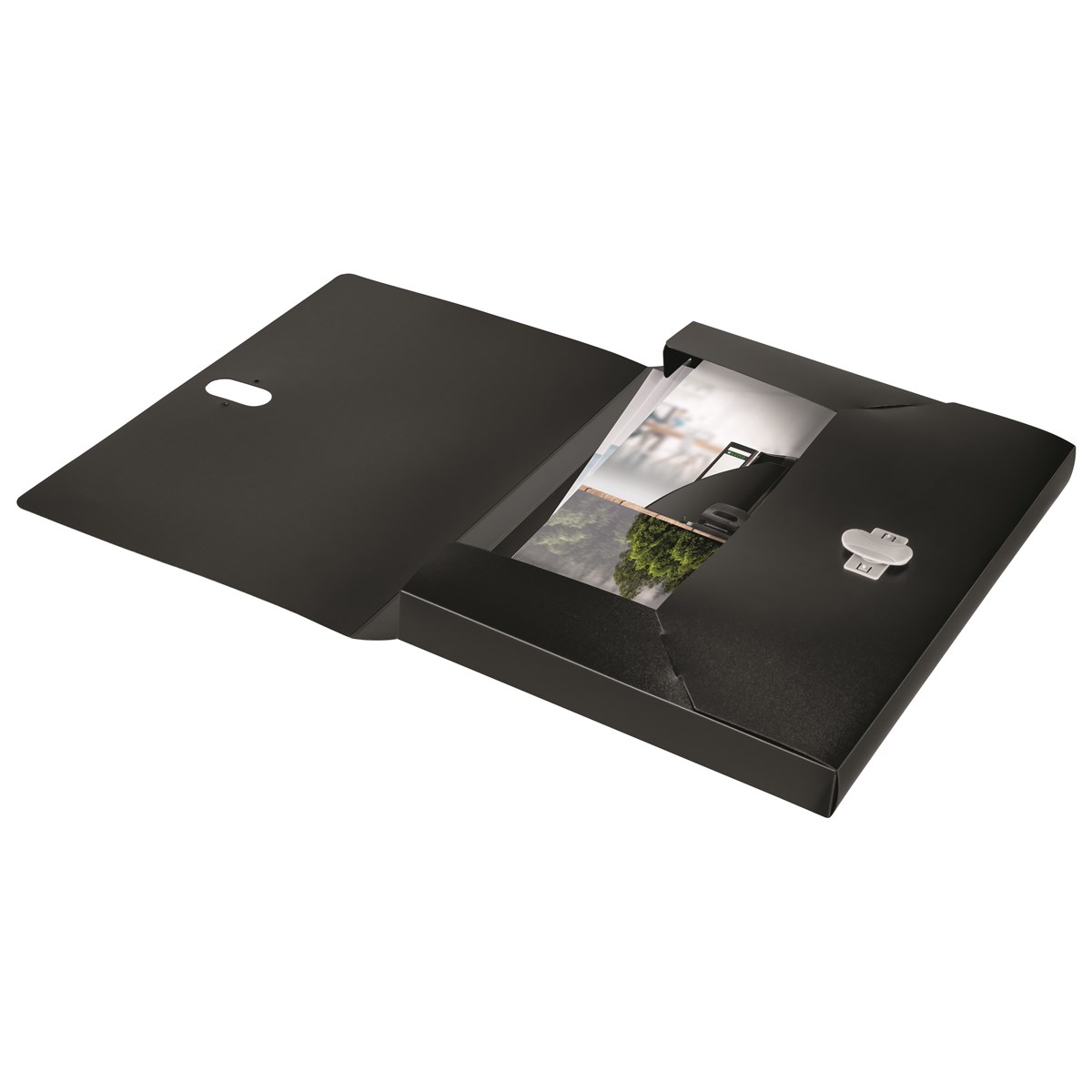För förvaring av dokument och lösa blad. Tillverkad av 100% återvunnet material och är 100% återvinningsbar. Säker, hållbar förslutning. Rymmer upp till 250 A4-ark. Svart.