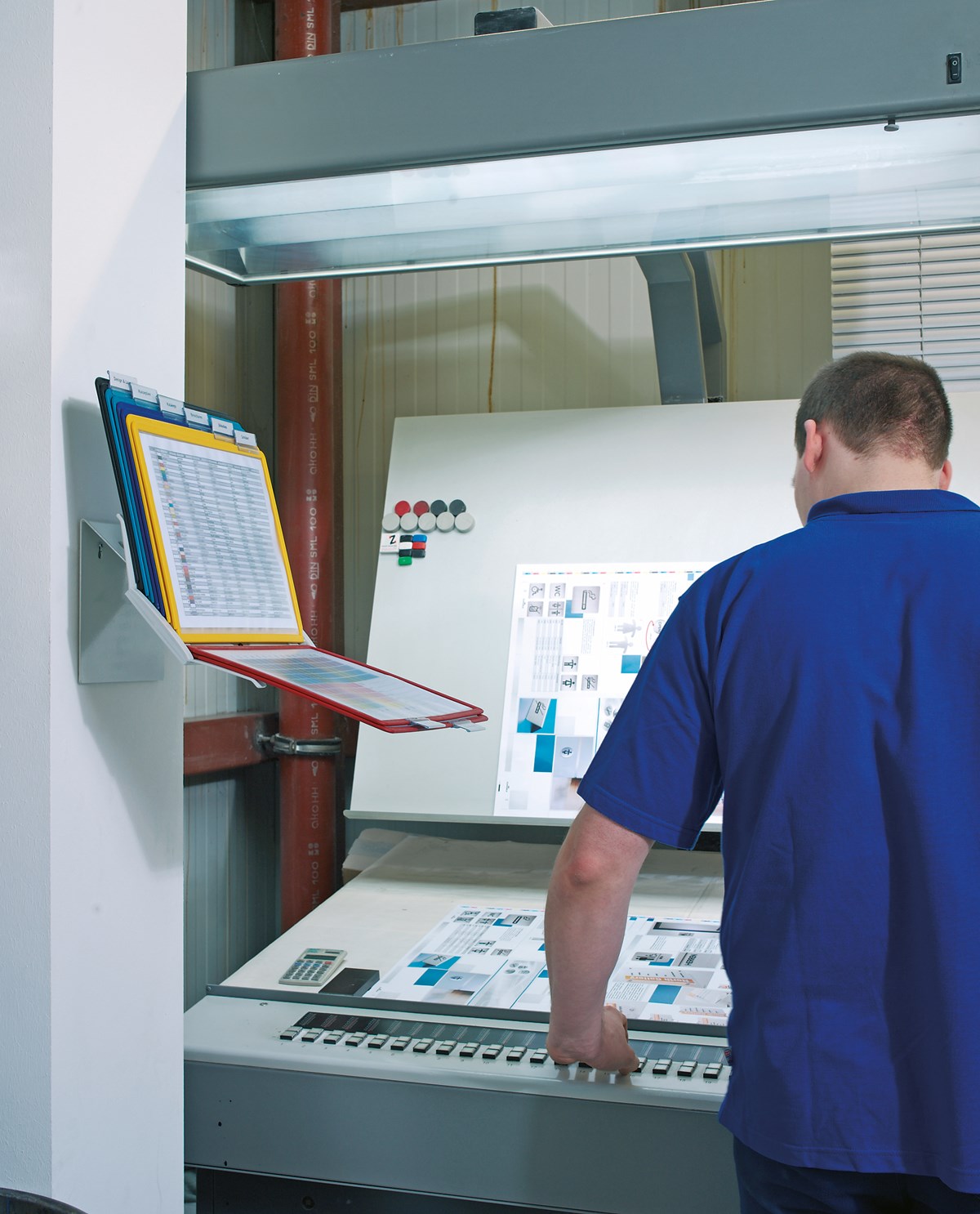 Multifunktionsställ av metall som kan användas som bordsställ eller väggställ i A4 stående och liggande format. Levereras komplett med 10 paneler (svart, röd, gul, grön och mörkblå) och rubrikhållare (58 mm). 5 års garanti.