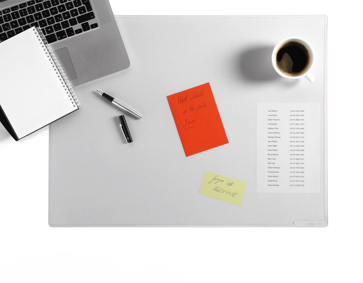 Skrivvänligt med matt/transparent specialplast med antiglidyta. Skyddar men döljer inte ett vackert skrivbord. Tillverkad i PVC.