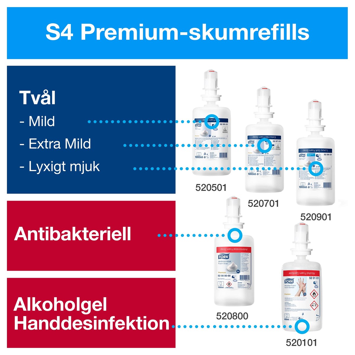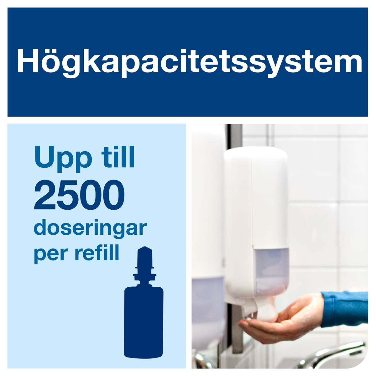 Hållare för Tork skumtvål och alkoholskum S4. Certifierad för enkel användning och garanterar god handhygien för alla besökare. Hög kapacitet, en skumtvålsflaska ger 2500 doseringar. Mått: H28,6 x B11,3 x D10,5 cm.