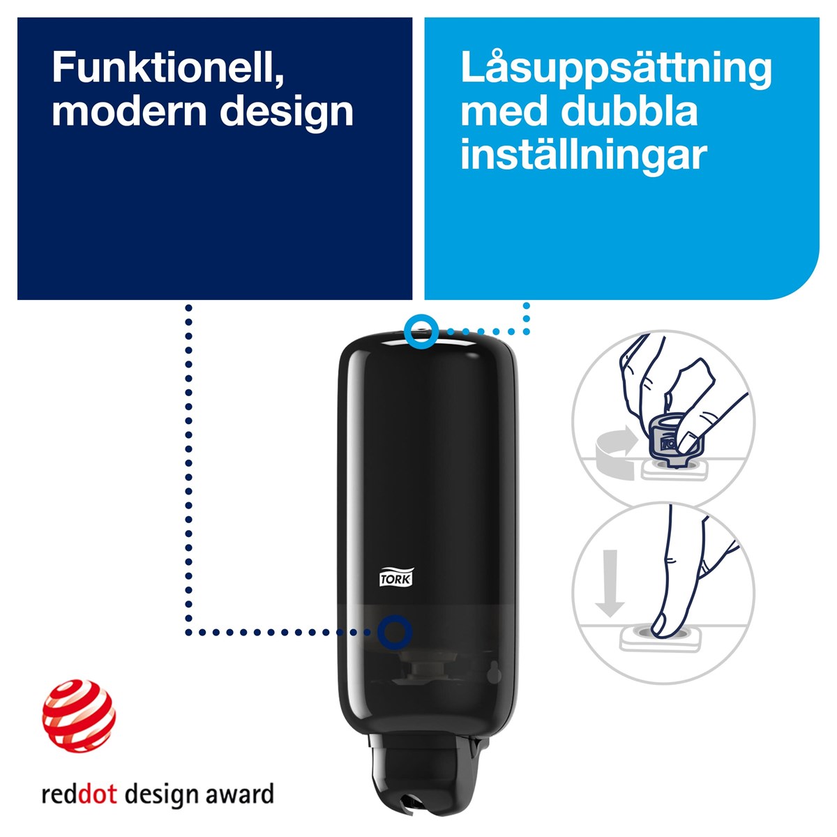 Stängt system garanterar maximal hygien Engångspump minimera risken för korskontaminering Lågt underhåll och användarvänlig, "Easy to use"-certifierad, med smidig tryckknapp Låsbar dispenser
