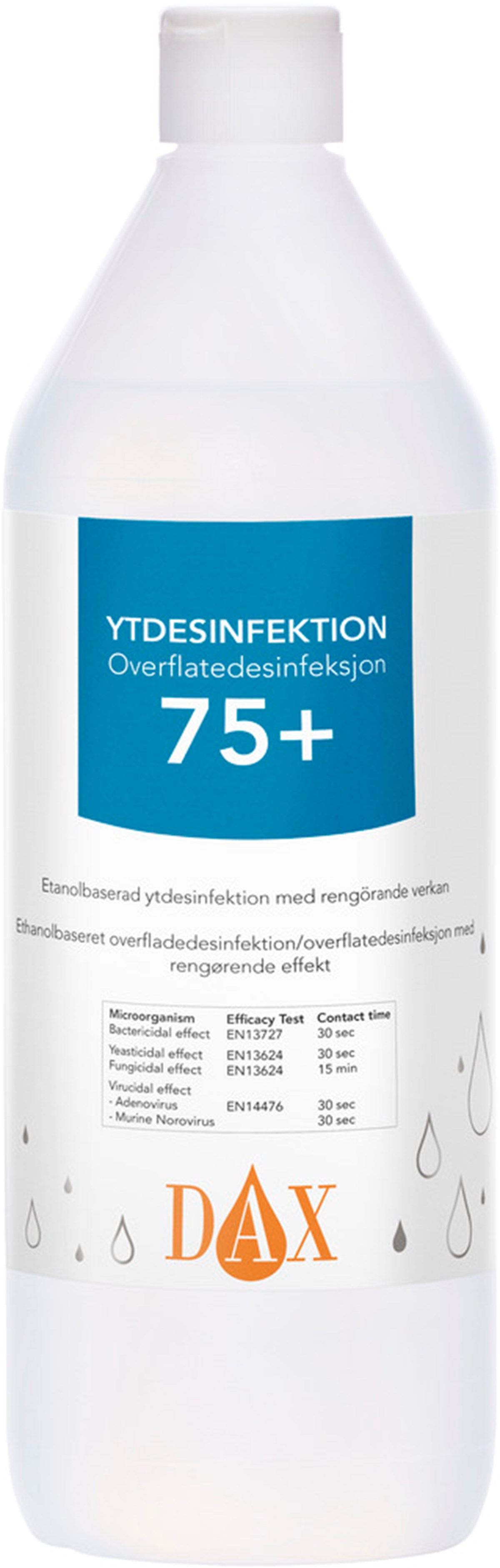 Avsedd för desinfektion av släta ytor, t.ex. bänkar, bord och undersökningsbritsar. Effektiv mot bakterier, svampar och olika typer av virus. Innehåller tensider. 75% alkohol. 1 liter.