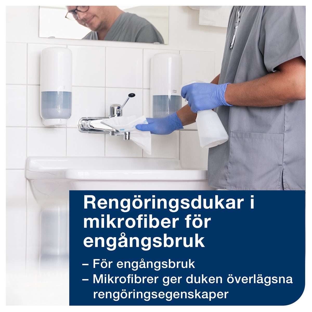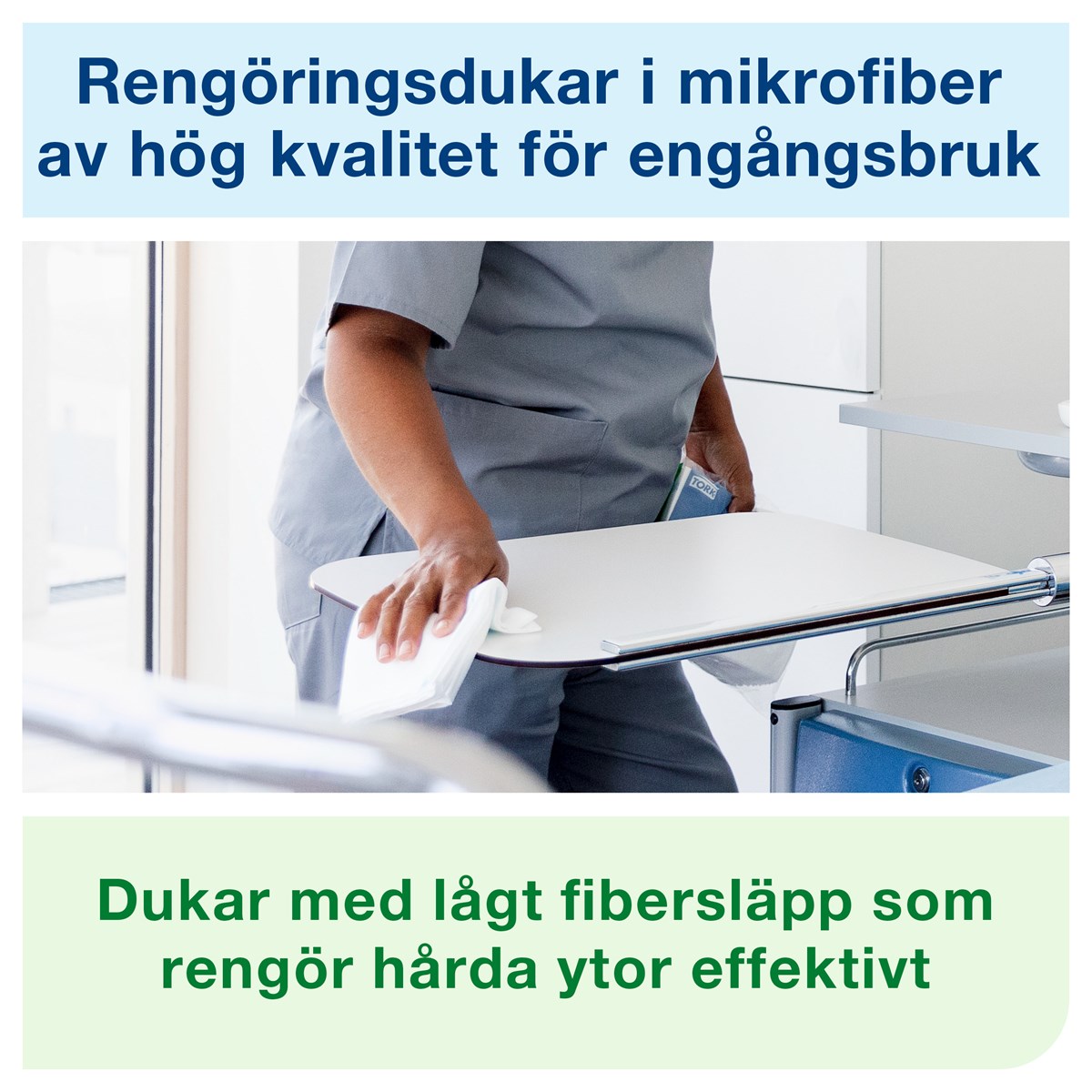 Effektiv städduk av 100% mikrofiber av hög kvalitet. kan användas både med och utan rengöringsmedel. Torkar bort 99,99% av mikroorganismerna från ytan. Perfekt för luddkänsliga ytor och miljöer. Designad för engångsanvändning. Mått: 29,5 x 34 cm. 40 st/förp., 8 förp./kartong.