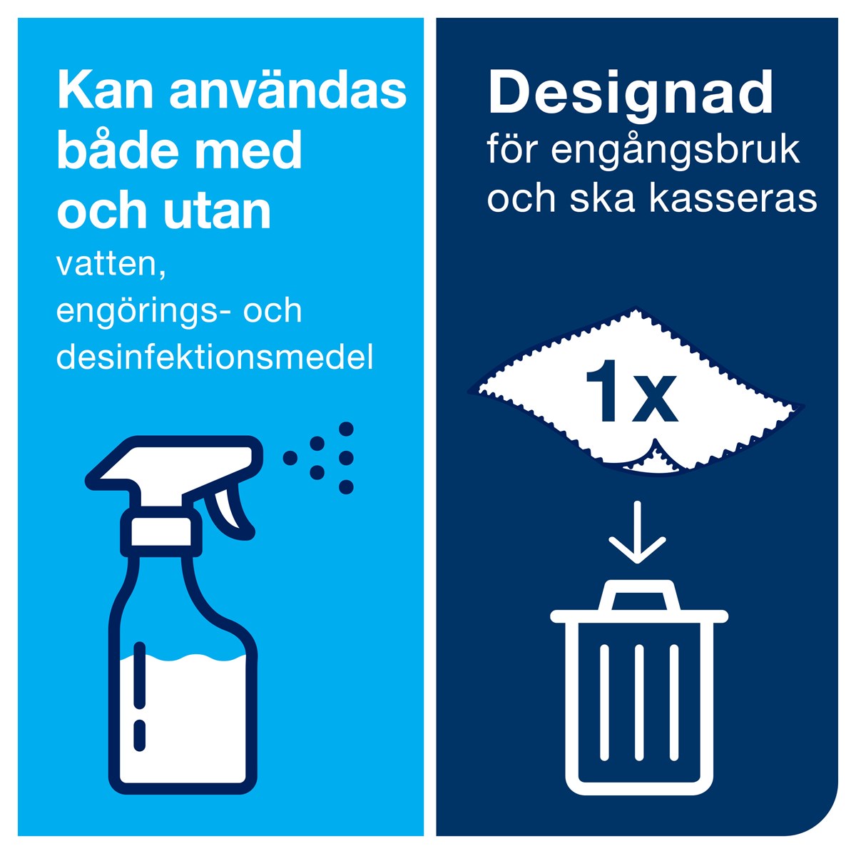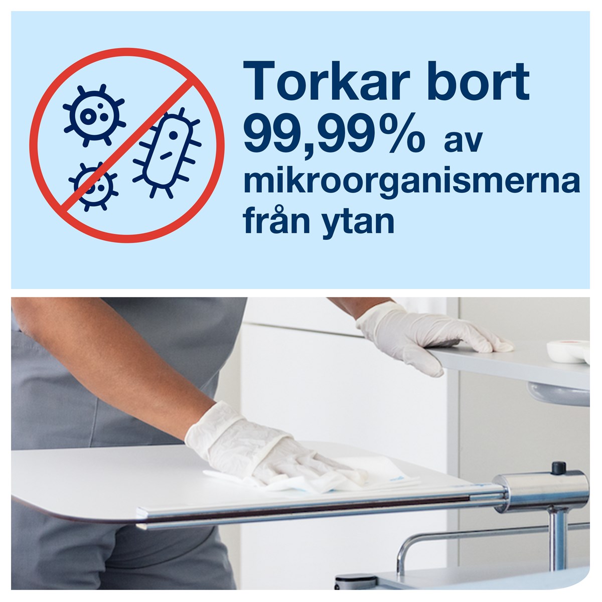 Utformad för engångsbruk Tar bort 99,9% av mikroorganismerna från ytan