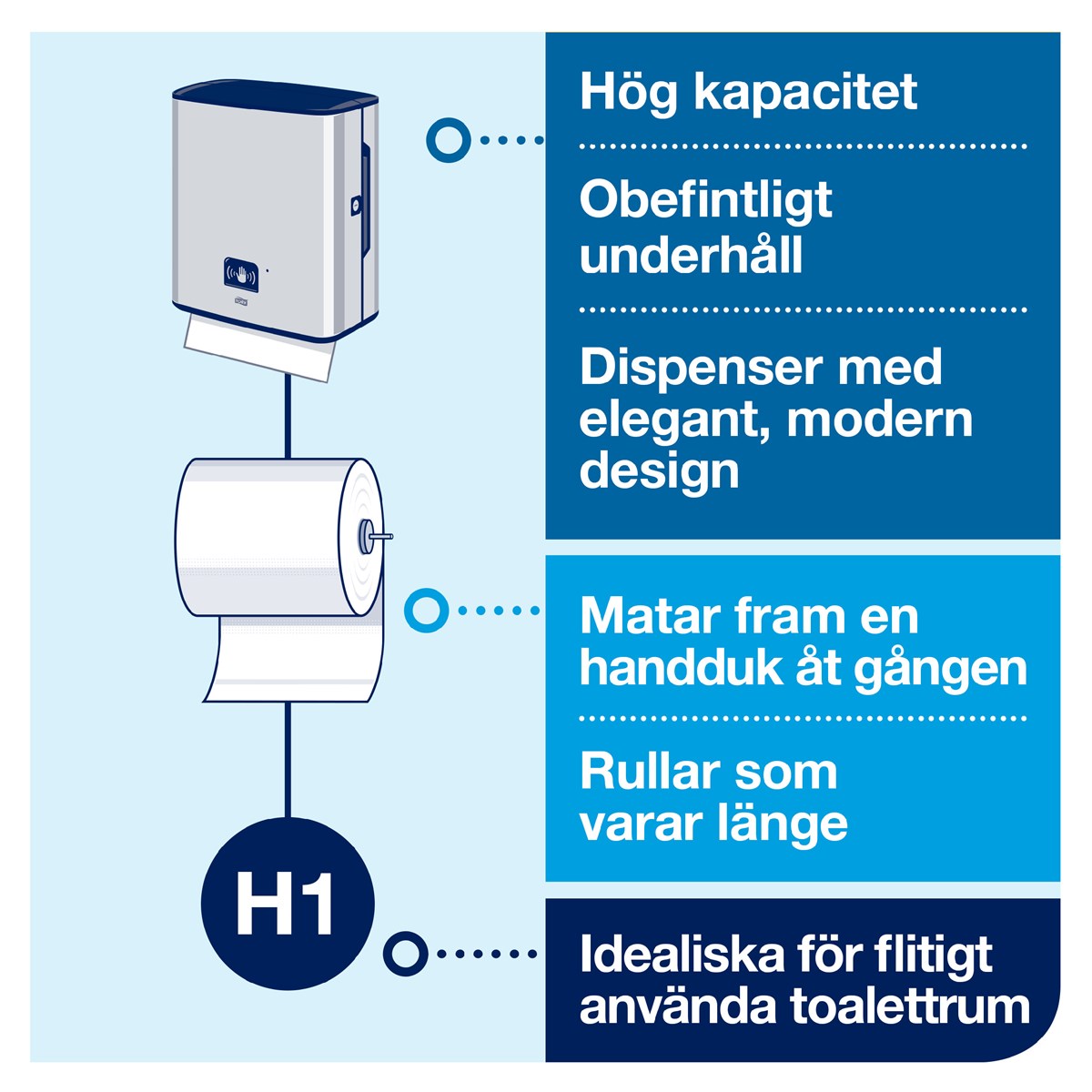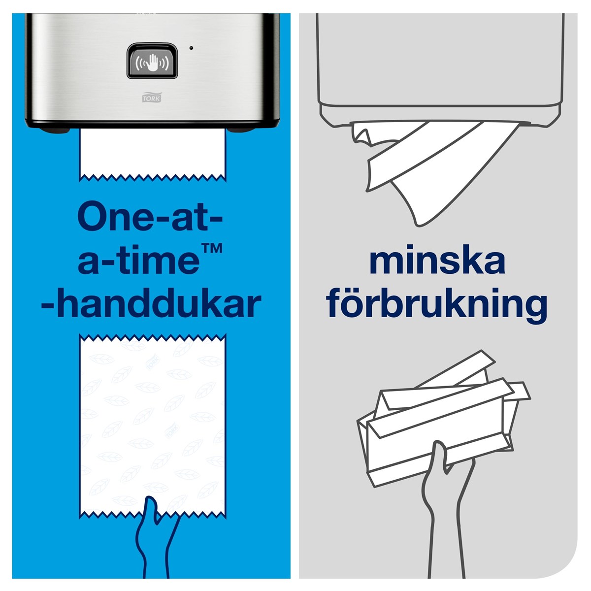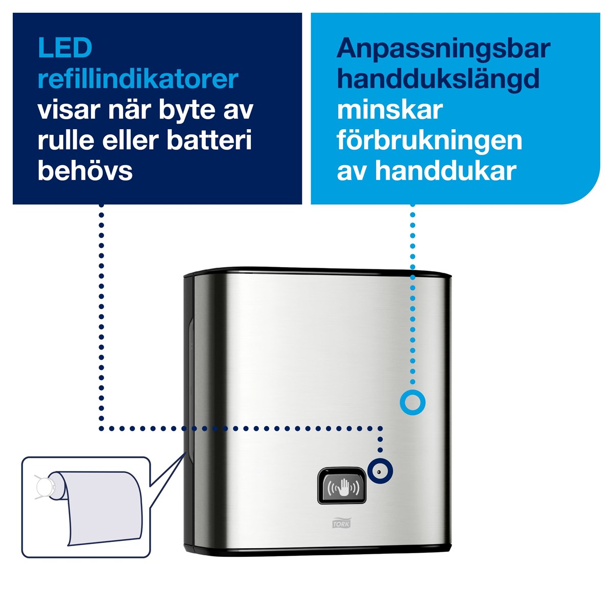 En handduk åt gången; minskar förbrukningen Beröringsfri utmatning LED-refillindikatorn som visar när påfyllning krävs Hög kapacitet