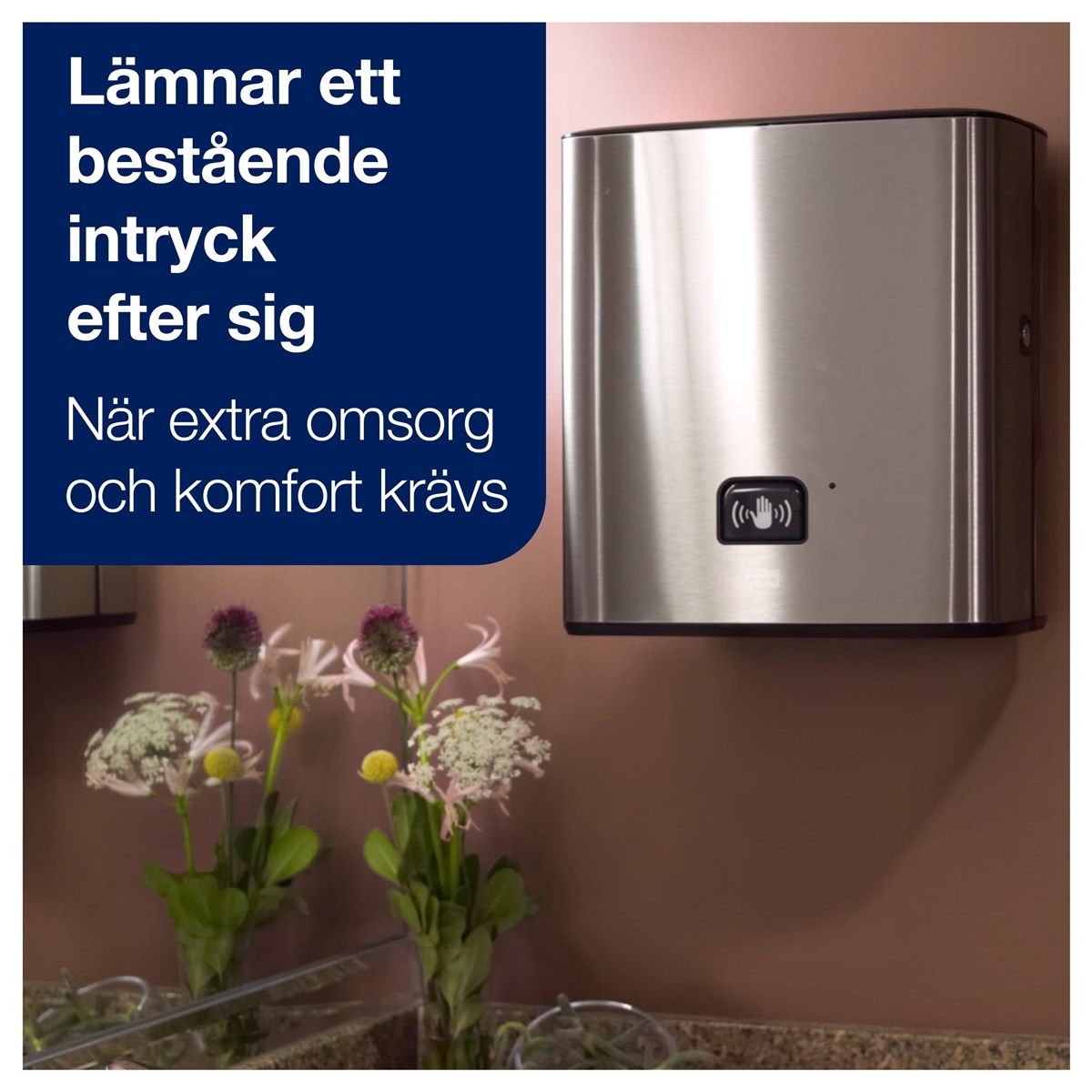 Rostfri, sensorstyrd hållare för handduksrullar. Känner av besökarens händer och matar då fram en handduk. Beröringsfri utmatning av en handduk i taget minskar förbrukningen och förbättrar hygienen. Enkelt underhåll med LED-påfyllningsindikatorn som visar när påfyllning behövs. Justerbar handdukslängd innebär att du kan välja den storlek som passar bäst i din verksamhet. Hög kapacitet. Mått: 37,3x34x20,4 cm. Drivs med tre 3 stycken LR20-batterier.