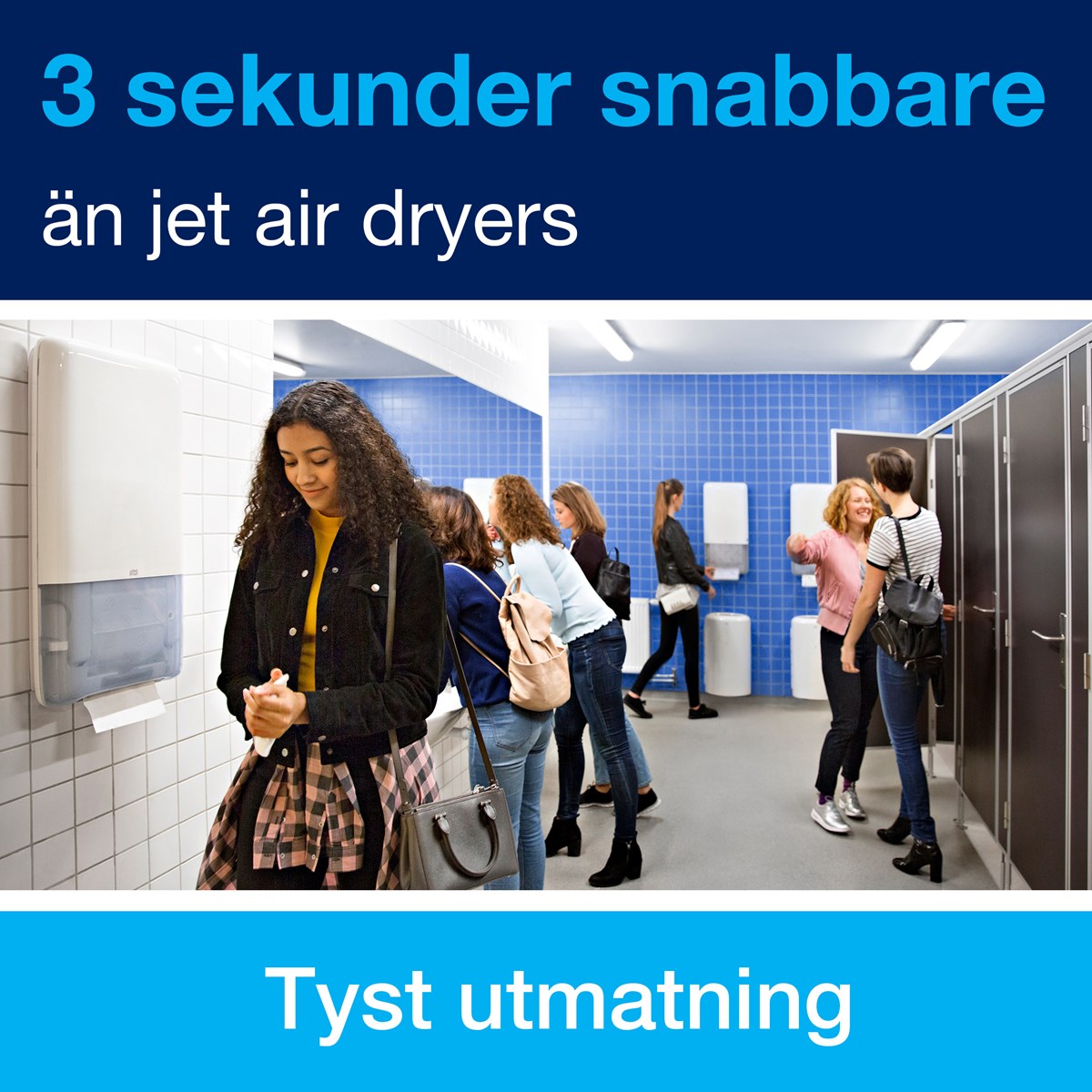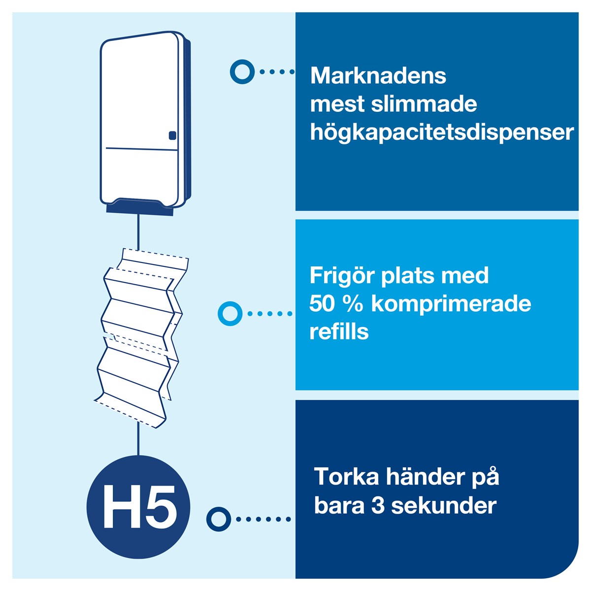 250 % högre kapacitet med 2 100 pappershanddukar i en slimmad behållare För välbesökta toalettutrymmen Smidig utmatning på tre sekunder Komprimerade buntar sparar plats på lager och på städvagnar
