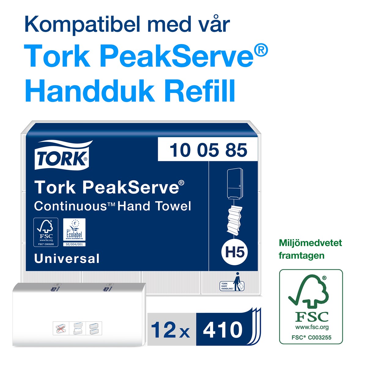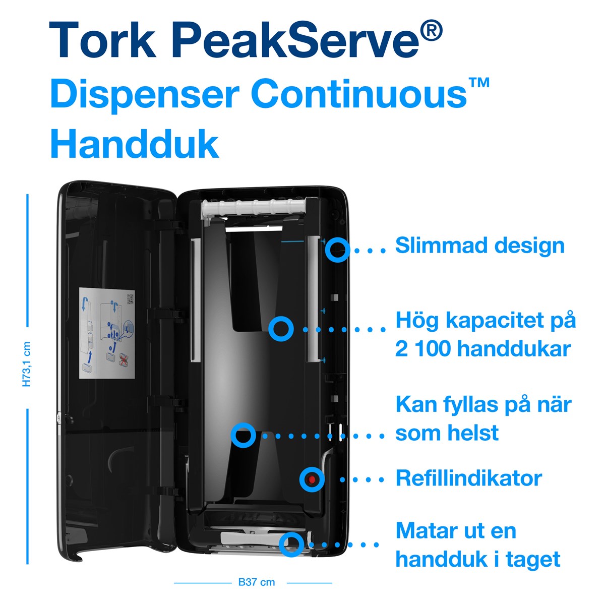 Utformad för högtrafikerade toalettutrymmen. Rymmer 2100 handdukar. Snabb utmatning och enkel att fylla på. Refillindikator visar när det finns en halv bunt kvar (ca 200 handdukar). Mått: (H x B x D) 73 x 37 x 10 cm.