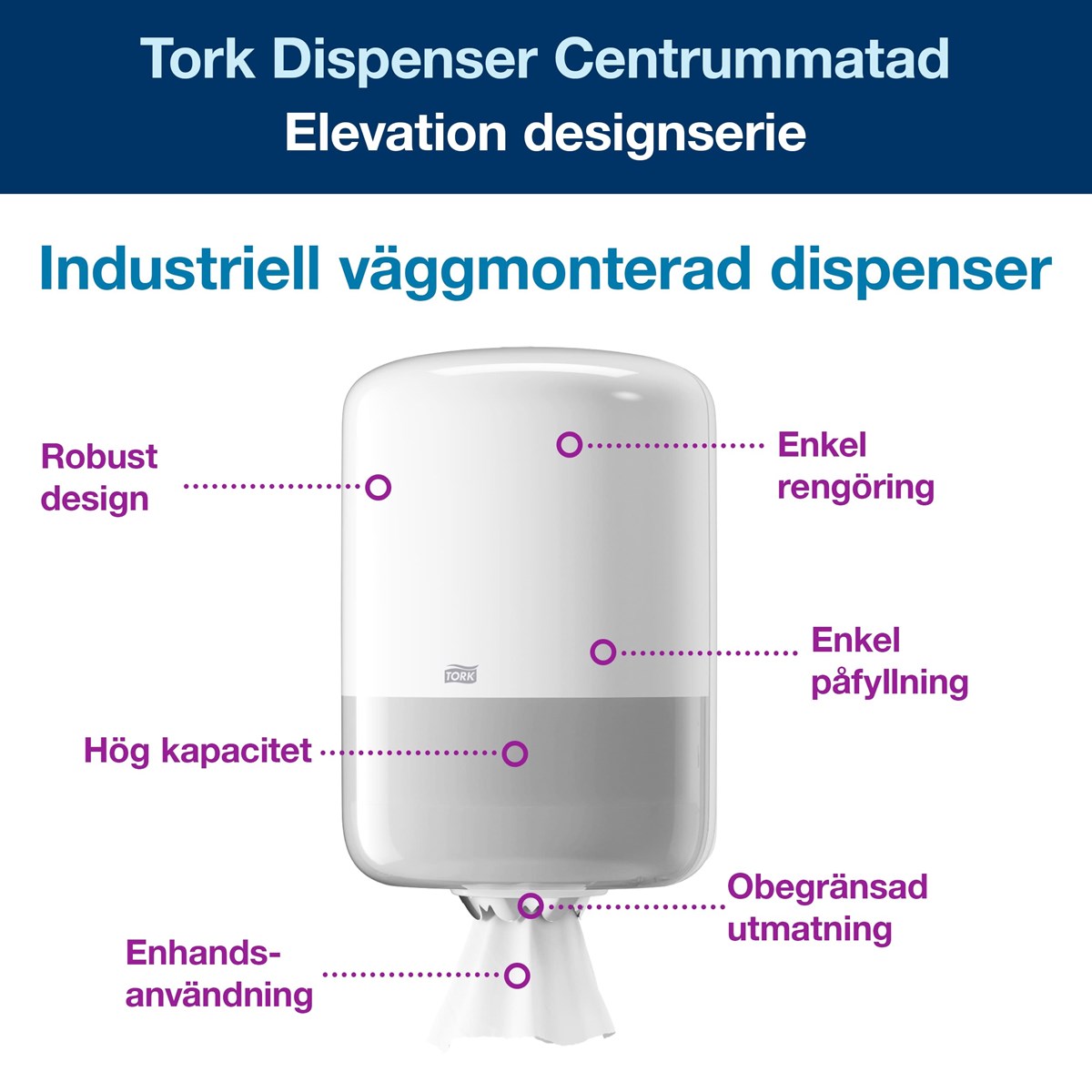 Klassisk hållare i plast för centrummatade M2-rullar. Starka tänder i rostfritt stål. Lätt att fylla på. Mått: (H x B x D) 36 x 23,9 x 22,7 cm.
