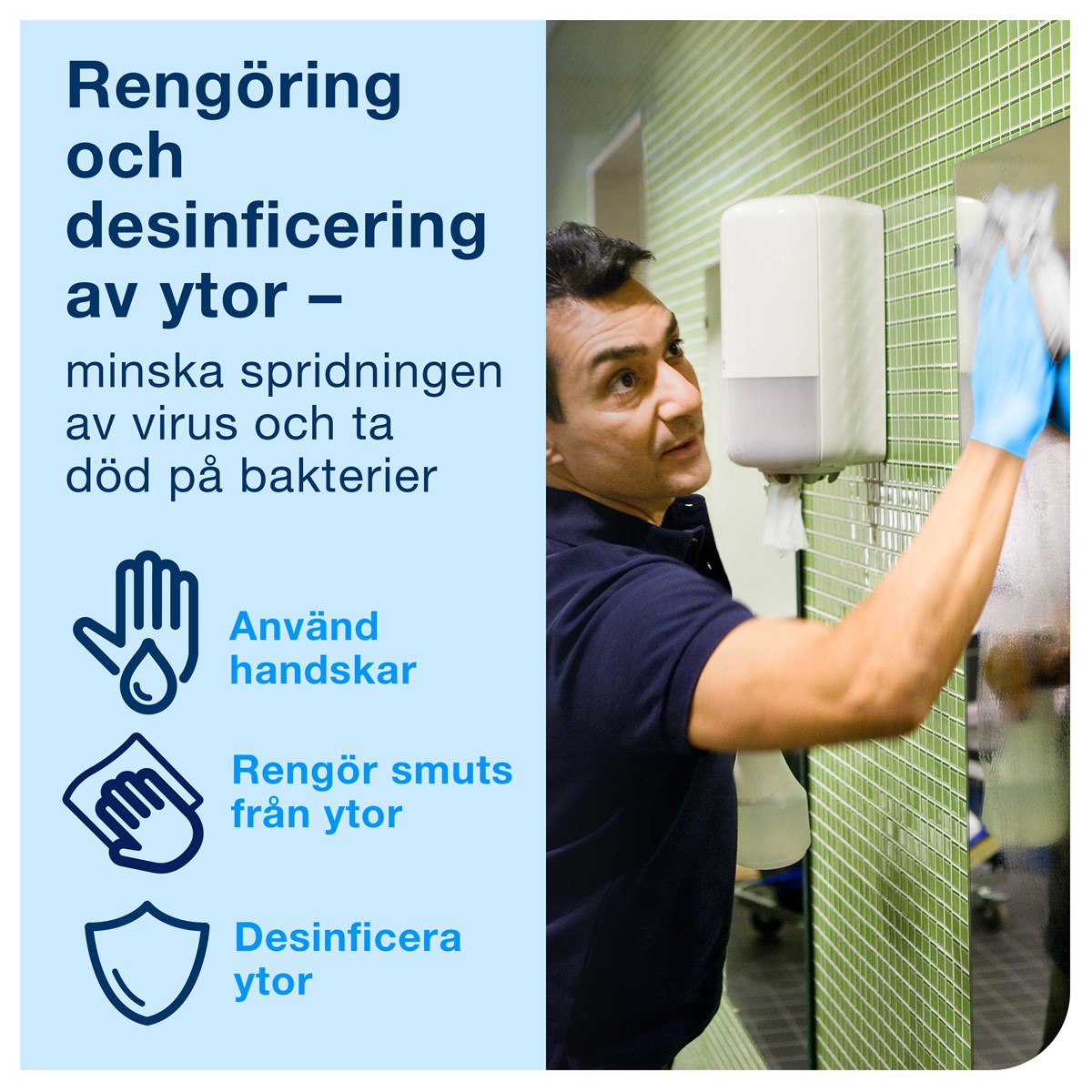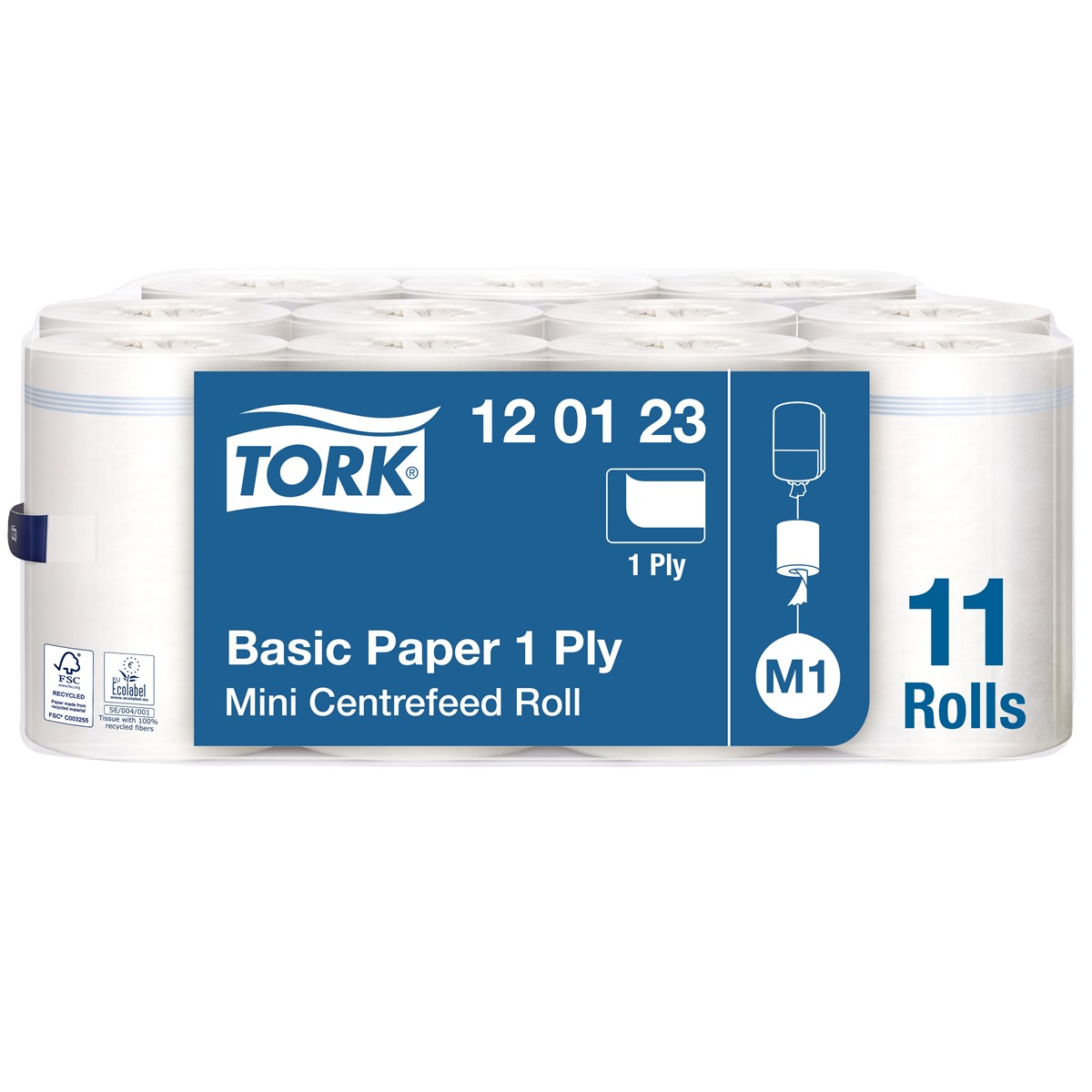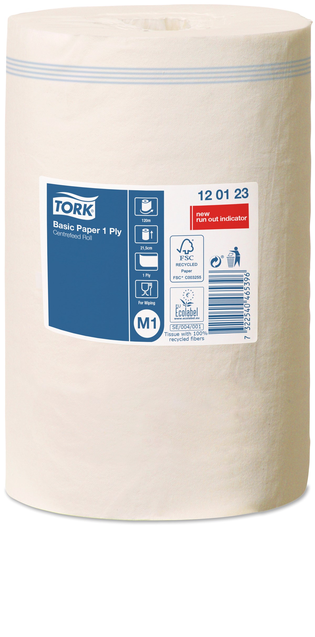 Centrummatat, vitt allroundpapper. Passar perfekt för lättare avtorkning och handavtorkning. Har slutindikator – När det är 4 m papper kvar, syns blå linjer som talar om att det är dags att byta rulle. 1-lag. Passar till Tork hållare Mini M1. 120 m, bredd 21,5 cm, 0,6 kg/rulle. 11 rl/förp.