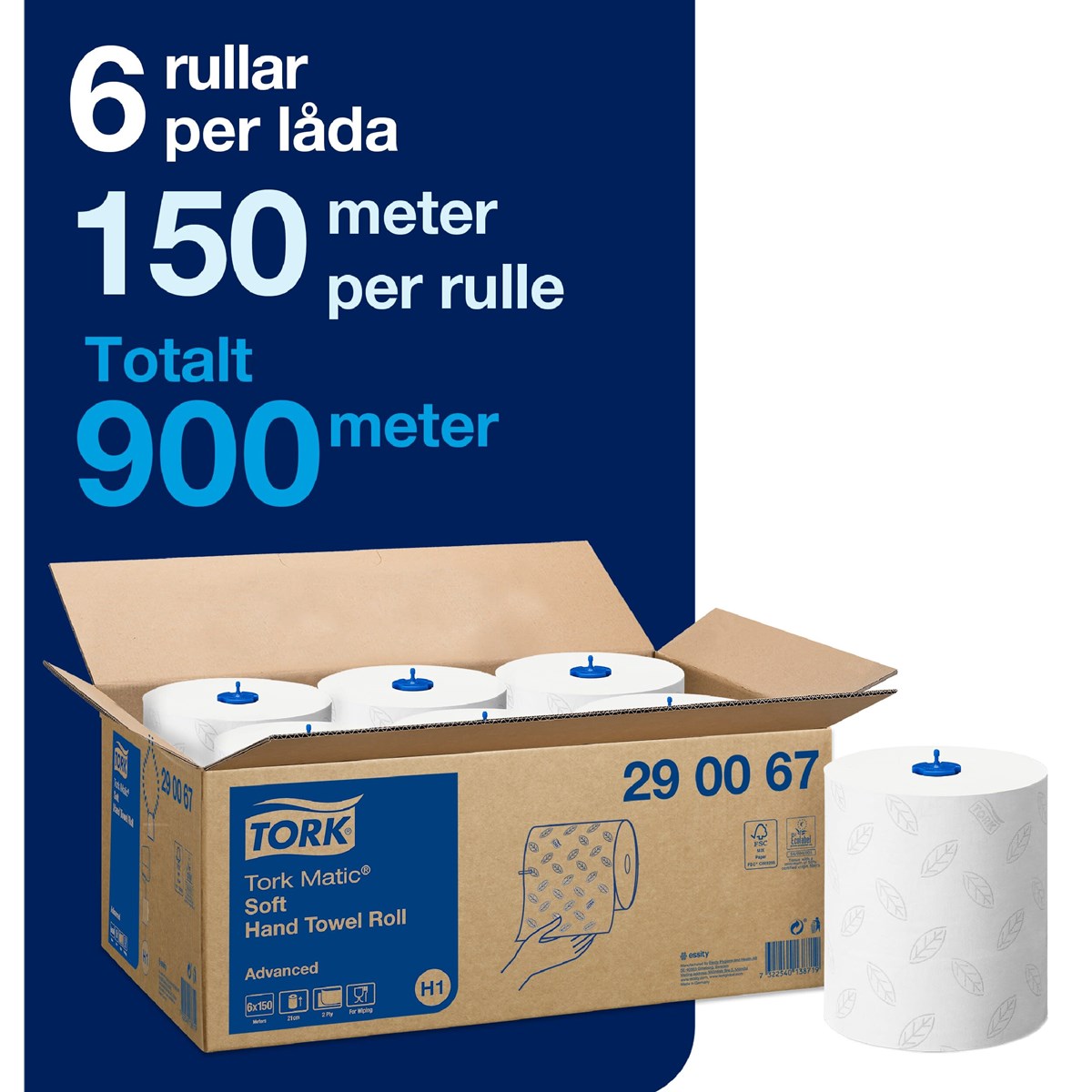 Mjuka pappershanddukar av hög kvalitet (Advanced). Vit, 2-lag. Dekorprägling i grått. 150 m, 612 ark/rulle, 21 cm bred, 1,3 kg. 6 rullar/förp. Passar till handdukshållare Tork Matic H1.