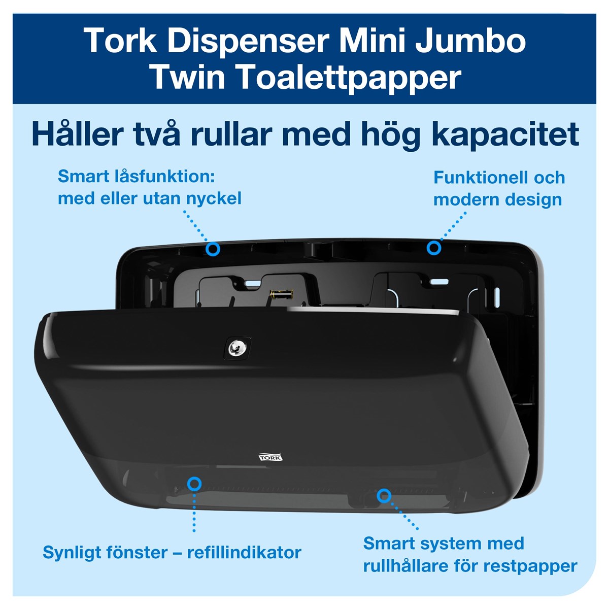 Modern hållare med hög kapacitet. För två Mini Jumbo T2-rullar. En rulle i taget används. Tillverkad i kraftig plast, låsbar. Mått: (H x B x D) 25,6 x 43,2 x 14,6 cm.