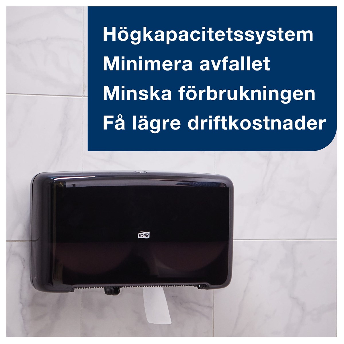 För välbesökta toalettutrymmen Sluten dispenser som skyddar rullarna och förbättrar hygienen Hög kapacitet för färre påfyllningar Optimal rullbroms minskar förbrukningen Använd båda rullarna fullt ut för att minska avfallet