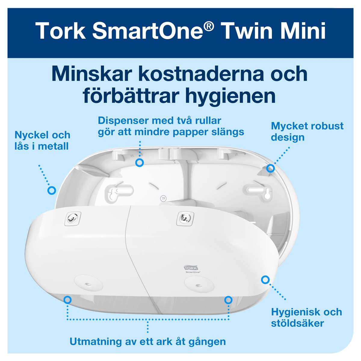 Robust twin-dispenser för välbesökta toalettutrymmen Hög kapacitet som minskar underhållstiden Bidrar till förbättrad hygien då gästerna endast vidrör det papper de använder Utmatning av ett ark i taget minskar förbrukningen Låsfunktion som skyddar rullarna