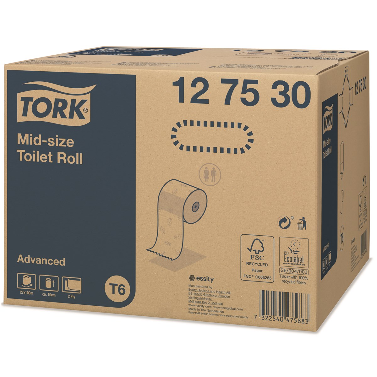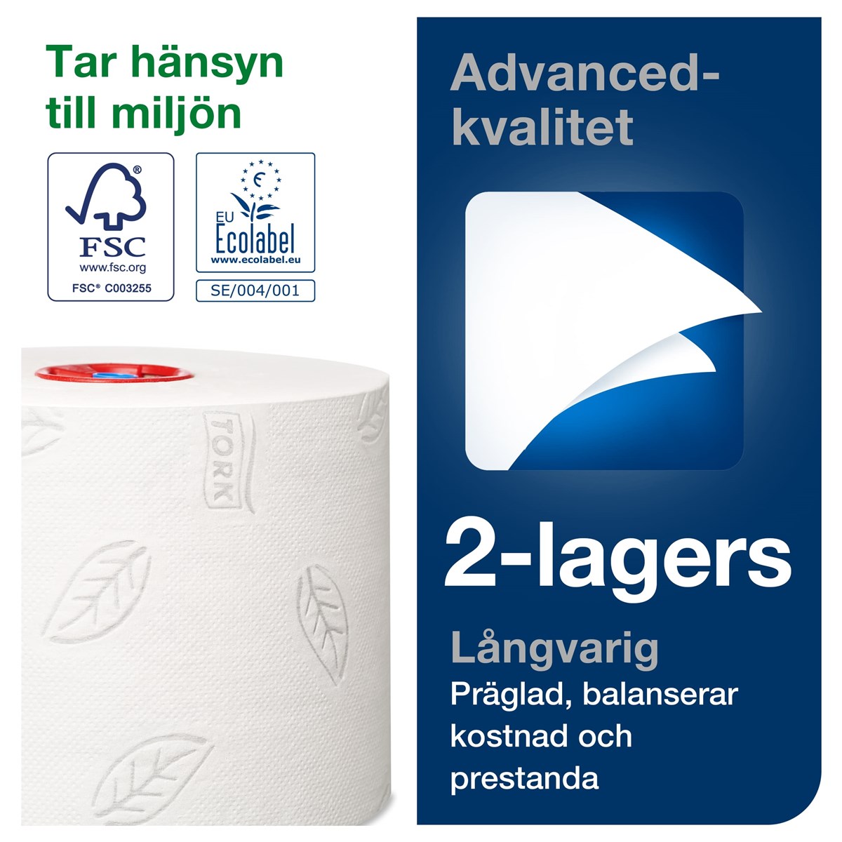 För toalettutrymmen med låg till medelhög besöksfrekvens Kompakt rulle med hög kapacitet Attraktiv design som gör ett gott intryck Tork Easy Handling kartong – enkel att bära och göra sig av med