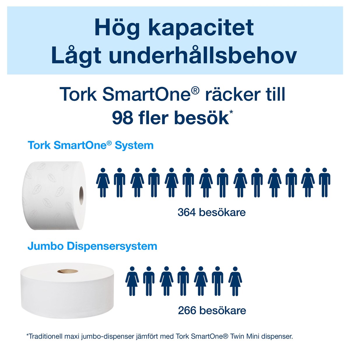 Hög kapacitet för kostnadseffektivitet och minskat underhåll Bidrar till förbättrad hygien då gästerna endast vidrör det papper de använder SmartCore gör påfyllningen snabb och enkel Effektiv upplösning minskar risken för stopp i avloppet